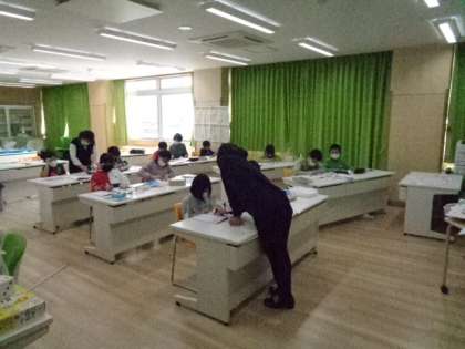 4年生は2つのグループに分かれて算数です。面と面との関係や展開図について学習しています。