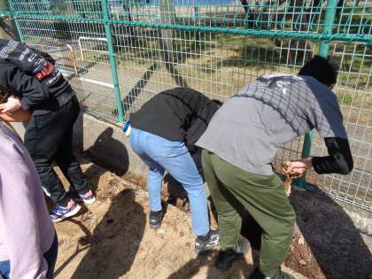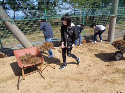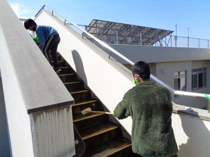 今日は、先週に引き続き、卒業プロジェクトの奉仕活動をしました。グラウンドの溝掃除や非常階段の掃除、前庭中庭の掃除を行いました。