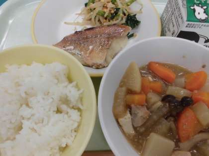 今日の給食は和食でした。煎り大豆が香ばしくゴマ煮はつややかで味が染み、赤魚もよい塩加減でどのおかずもとてもおいしかったです。