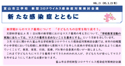 「富山市立学校 新型コロナウイルス感染症対策検討会議だより」21号が発行されました。今回は、4月からマスク着用を求めないことについて、富山市立学校新型コロナウイルス感染症対策会議で話し合われた内容が書かれています。保護者の皆様には本日お子様を通して配付しました。本ホームページでも両面全文を見ることができます。右側のコーナー、または下の部分をクリックしてください。なお、右のコーナーではこれまでのバックナンバーも見ることができますのでご利用ください。