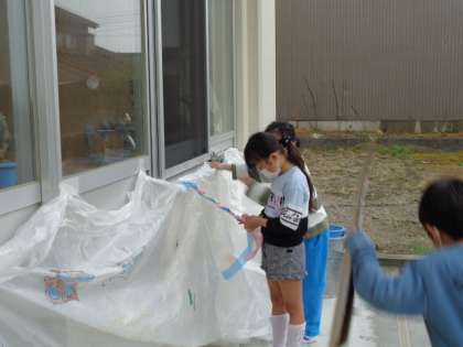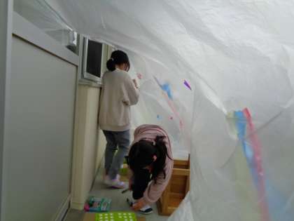 大きなビニールシートを使ってテントをつくり、テントの外側や中側にマジックで絵を描きました。また、テントの中に段ボールを敷いておうちのようにしました。