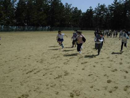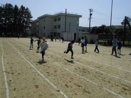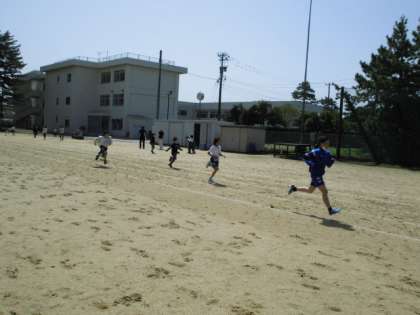 今日もよい天気で、のびのびタイムには全校児童がグラウンドに出て力いっぱい走りました。短距離走のコースは、30m、50m、70mの3コースが用意され、子供たちが自分で選んで走ります。今日は、30mコースが人気で、新しく入った1年生と一緒に走る上級生の姿もありました。