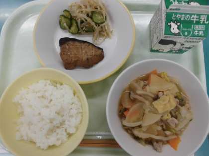 今日の給食の献立は、 ・ごはん ・ふくらぎの照り焼き ・ごまずあえ ・ちゃんこ鍋 ・牛乳 です。