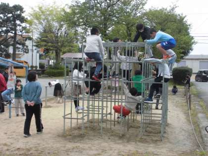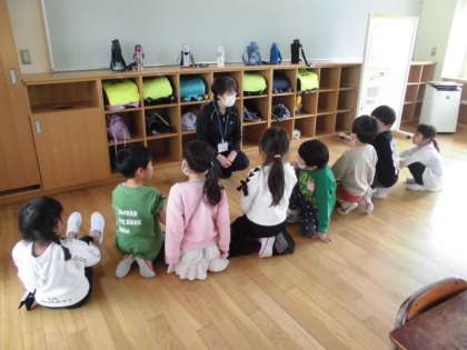 左:1年生は、先生と「休み時間のお約束」を確認してから外遊びに行きました。