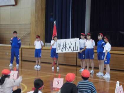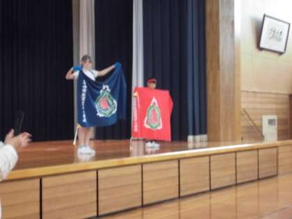 運動会は、赤青の2つの団に分かれて戦います。今日は、結団式を行いました。校長先生から2人の団長に団旗が手渡されました。