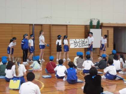 その後は、各団に分かれてはじめての応援練習をしました。赤団は「風林火山」、青団は「一致団結」のスローガンのもと、声を上げて士気を高めました。