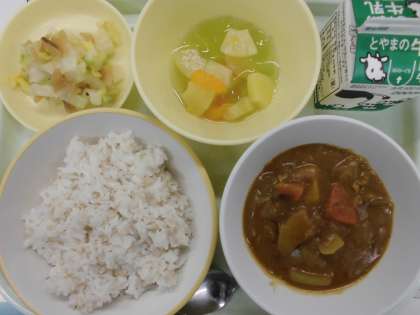 4月27日(木)今日の給食 公開日 2023/04/27 更新日 2023/04/27 給食 今日の給食の献立は、 ・むぎごはん ・カレーライス ・フルーツゼリーミックス ・ふくじんあえ ・牛乳 です。