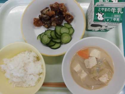 今日の給食の献立は、 ・ごはん ・豚肉とレバーのあげからめ ・きゅうりもみ ・ごまけんちん ・牛乳 です。
