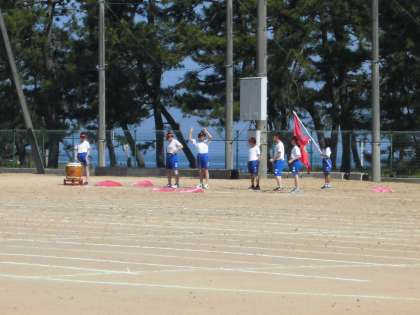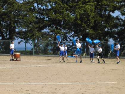 グラウンドでは6年生が運動会に向けて応援練習をしていました。団のメンバーで話し合いながら振り付けやかけ声を決める姿が見られました。
