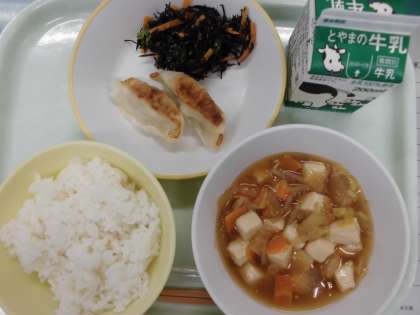 今日の給食の献立は、 ・ごはん ・ひじきのごま和え ・焼き餃子 ・とうふの野菜あんかけ ・牛乳 です。