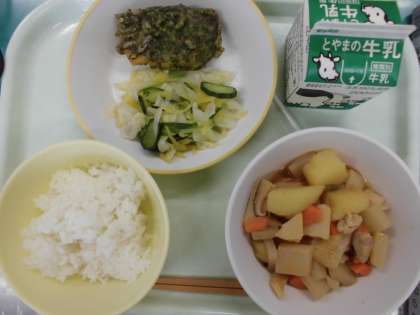 今日の給食の献立は、 ・ごはん ・魚の磯辺揚げ ・あわせ和え ・筑前炊き ・牛乳 です。