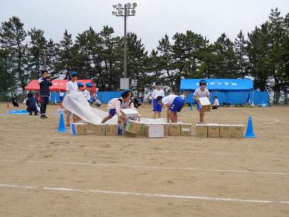 縦割り班競技の様子です。まずは箱を協力して運びます。