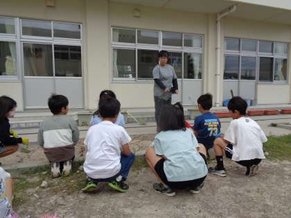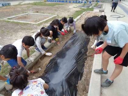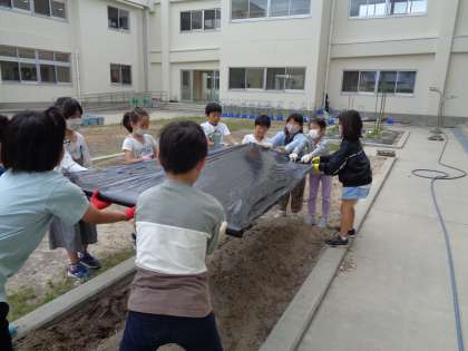 3年生は、総合的な学習の時間にひょうたんを育てています。今日は、学年の畑に植え替え前の準備をしました。雑草が生えないようにマルチシートをかぶせようと考え、用務員さんに手順を教えていただきながら、自分たちでシートをかぶせました。最後に周りを土で押さえ、シートが飛ばないようにしました。しっかりと植え替えの準備ができました。