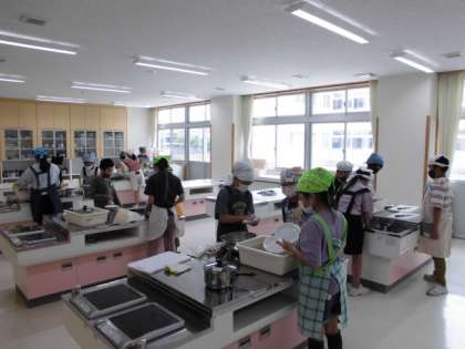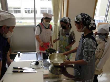 今回は、ほうれん草のおひたしとゆでいもを作りました。野菜によって、ゆで方が違うことを学習した子供たちは、学んだことを生かし、青菜は湯から、ジャガイモは水からゆでました。班の仲間と協力しながら、活動することができました。