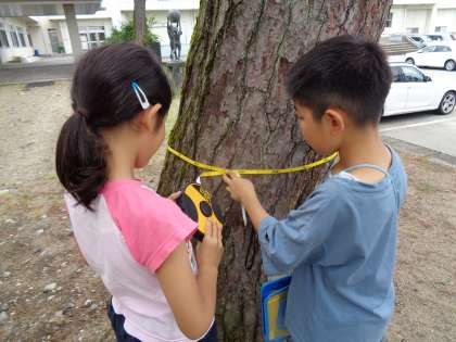 算数科では、まきじゃくを使って長い物の長さをはかる学習をしています。今日は、学校の松の木の周りの長さをはかってみました。まきじゃくがすぐにずれてしまうので大変でした。まきじゃくを使うといろいろな物の長さがはかれることが分かりました。