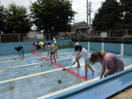 たわしやデッキブラシを使い、一生懸命清掃したので、ピカピカのプールになりました。来週から始まる水泳学習、楽しみですね。