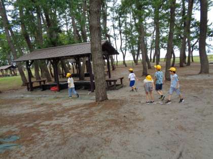 最初に、「すてき見つけ」をしました。子供たちは、バーベキュー棟がたくさんあることやきれいな花壇があることなどに気付いたり、貝殻を見付けたりしていました。