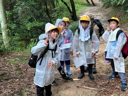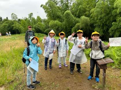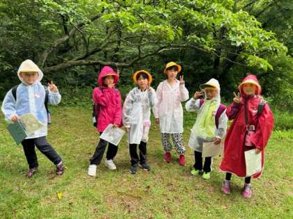 森の木オリエンテーリングです。時折、小雨が降りましたが、どの班も協力しながら、木を見付けました。友達を励ます温かい声がたくさん聞かれました。