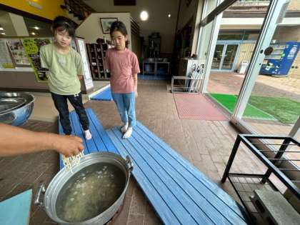 生地を延ばして切っています。切り終わった班から、茹であげます。