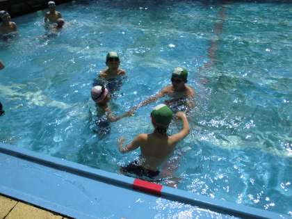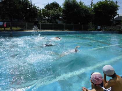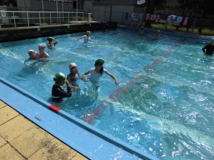 1年生と6年生が一緒にプールに入りました。6年生は1年生のお世話をしたり、手をつないでプールの中をぐるぐる回ったりしました。子供たちは、とても気持ちよさそうでした。