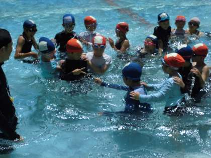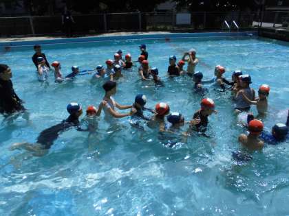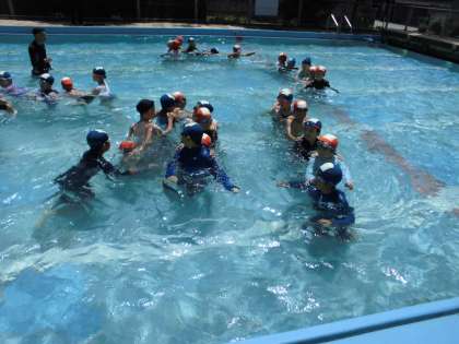 2年生と5年生は、プールの中でじゃんけん列車をしました。