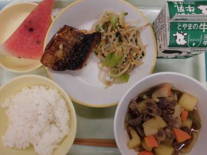今日の給食の献立は、 ・ごはん ・鯖の塩焼き ・いり大豆和え ・肉じゃが ・すいか ・牛乳 です。