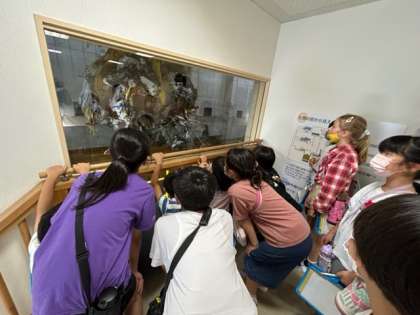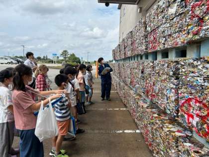 次の見学先は、リサイクルセンターです。アルミ缶やスチール缶のプレスされたかたまりや燃やせないごみがクレーンで運ばれている様子を見ました。分別の大切さを感じていました。