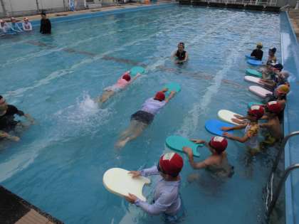 泳力別に2つのグループに分かれて指導していただきました。どちらのグループも分かりやすく丁寧に指導していただき、泳げる距離が伸びた子、泳ぎのフォームが美しくなった子など、それぞれ成長を感じることができた時間でした。