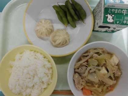 今日の給食の献立は、 ・ごはん ・えびパオツ ・枝豆 ・韓国風すきやき ・牛乳 です。