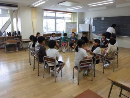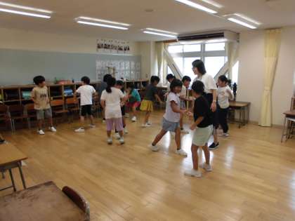 みんなで楽しくじゃんけん列車をしたり、円になって夏休みの思い出を発表したりしています。