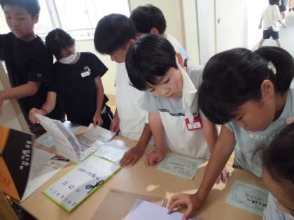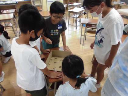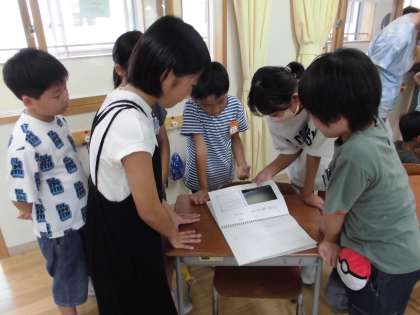 今日のロングわくわくタイムは、なかよし班で、夏休みの作品展を見て回りました。班のメンバーに、自分の研究内容を紹介したり、工作を使ってみんなで遊んだりしました。