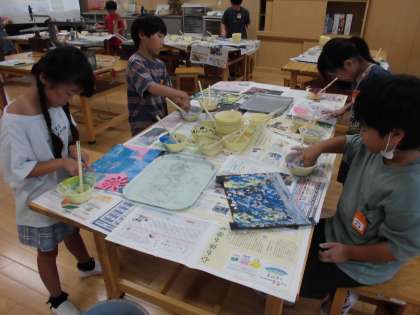 とろとろ絵の具は、混ぜ方によってボソボソとした感触になったり、とろっとした感触になったりするようで、子供たちはでき上がった色や感触を楽しみながら、自分の表したいことを見付け、思い思いに表現活動をしていました。