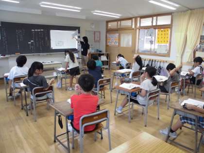 1年生、国語です。登場人物の気持ちになって、お話ししています。