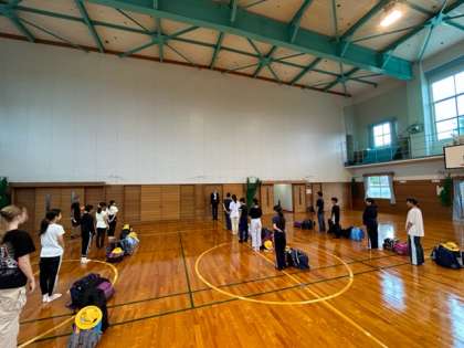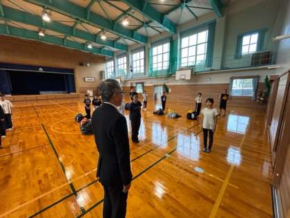 15人全員が、元気に登校しまし、体育館で出発式を行いました。