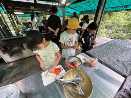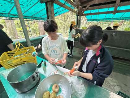かまど班がご飯を炊いている間に、調理班は、カレーの野菜を切っています。