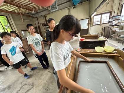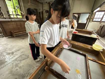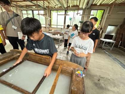 2つのグループは、和紙すき体験に挑戦です。みんな、真剣な表情で取り組んでいます。