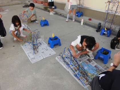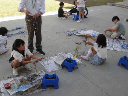 大切に育てた朝顔のつるを使い、リース作りをしています。