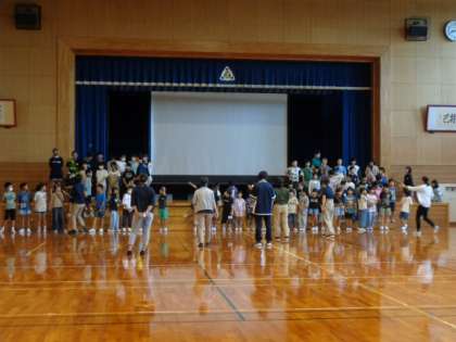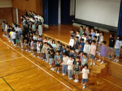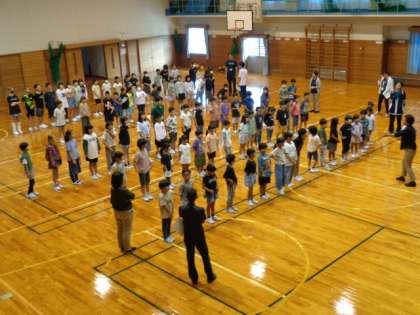創校150周年記念式典で全校合唱を披露します。全校児童が体育館に集まり、並ぶ隊形の確認をしました。