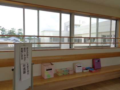 エアコンが設置されていない部屋や廊下に網戸が設置されました。場所は、理科室4枚、多目的室4枚、2階渡り廊下4枚です。窓からはさわやかな秋風が入ってきました。