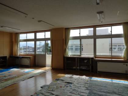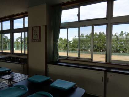 エアコンが設置されていない部屋や廊下に網戸が設置されました。場所は、理科室4枚、多目的室4枚、2階渡り廊下4枚です。窓からはさわやかな秋風が入ってきました。