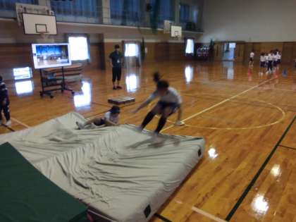 ICT機器を使い、高跳びの様子を撮影して自分の跳んでいる姿を確認しながら練習しています。