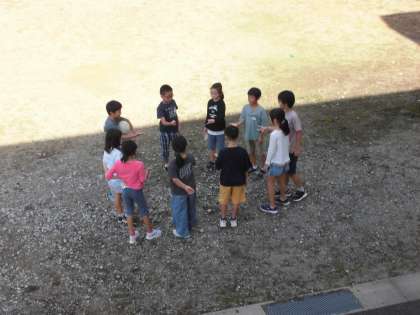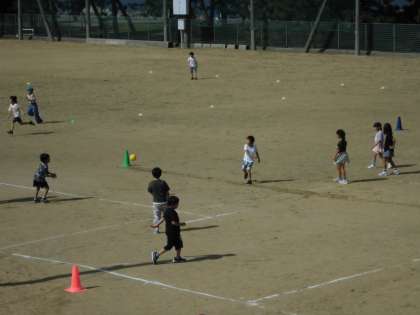 写真は、グラウンドで遊んでいる1年生と3年生です。