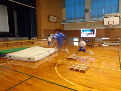 今回も3、4年生合同で走り幅跳びの学習をしました。踏切の足のリズムや踏み切った後の手や足の動きを何度も練習しました。モニターには自分が跳んだ姿が15秒後に映ります。モニターで自分の跳ぶ姿を見て何度も練習しました。