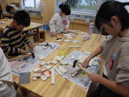 図工の様子です。先週はノコギリを使っていた4年生ですが、今週は金づちと釘を使っています。上手に道具を使い、思い思いの作品を作っています。