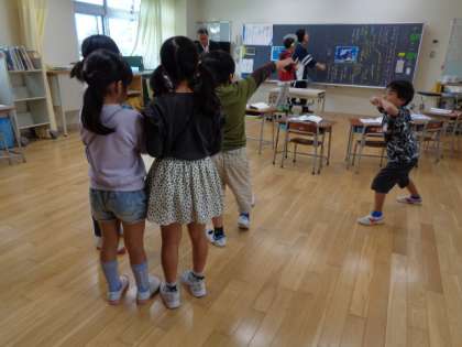 国語科「くじらぐも」の学習です。空のくじらと学校の子供たちとに分かれて演じながら登場人物の気持ちを考えました。「もっとたかく。もっとたかく。」「天までとどけ 一 二 三。」