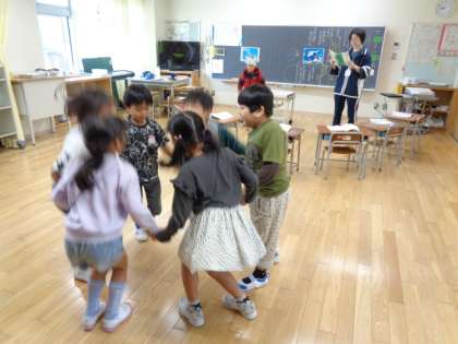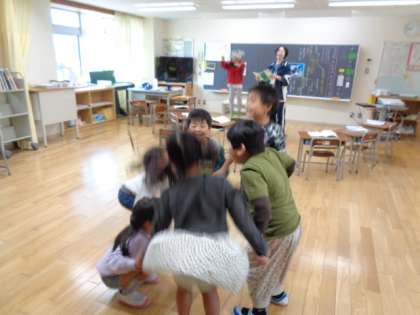 国語科「くじらぐも」の学習です。空のくじらと学校の子供たちとに分かれて演じながら登場人物の気持ちを考えました。「もっとたかく。もっとたかく。」「天までとどけ 一 二 三。」