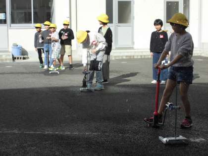 理科の授業で、空気と水の性質について学習をしています。今日は、ペットボトルロケットを飛ばしました。