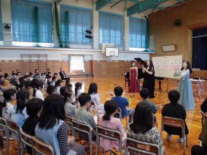 音楽家の方々を招き、コンサートを開きました。ソプラノの歌声、フルートやピアノの音色にうっとりする子供たちでした。演奏を聴いた後は、一緒にリズムリレーをしたり校歌を歌ったりしました。本物の音楽に触れる貴重な経験となりました。ありがとうございました。