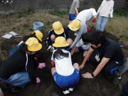 縦割り班で育ててきたさつまいもをみんなで掘りました。