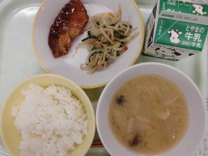 今日の給食の献立は、 ・ごはん ・赤魚の照り焼き ・香味和え ・いものこ汁 ・牛乳 です。